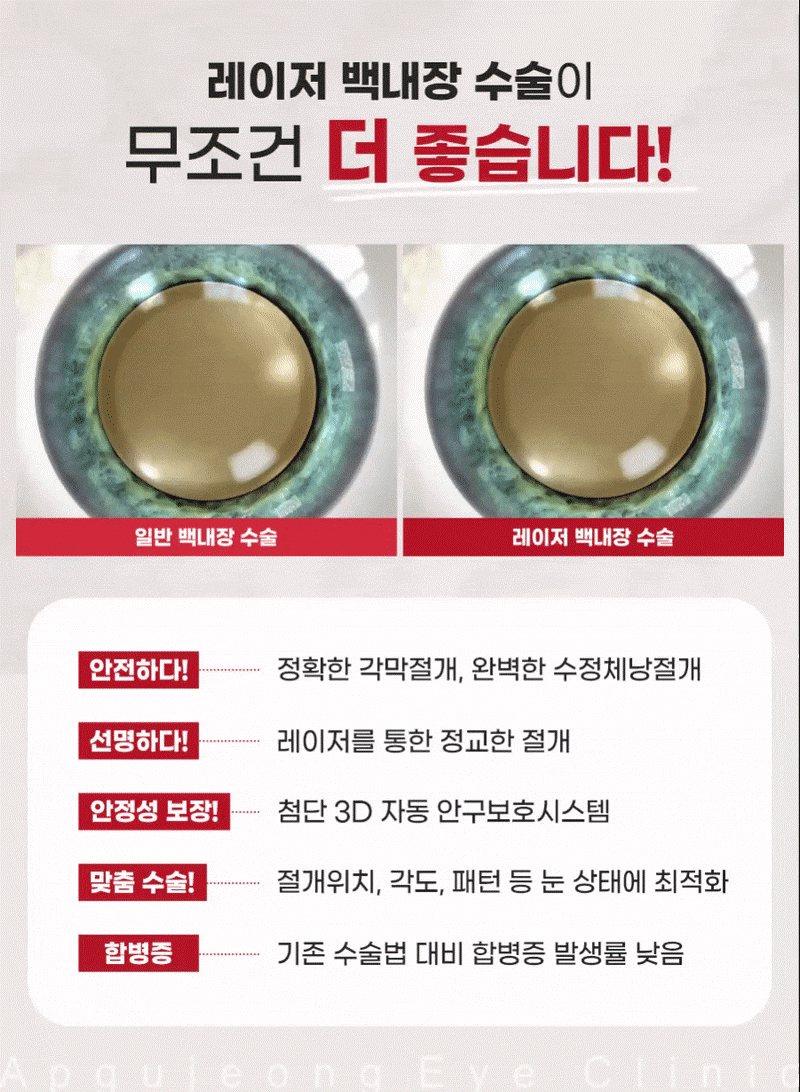 이러한 수기 방식의 단점을 보완한 것이 레이저 장비를 사용한 백내장 노안 수술이었습니다. 세밀한 정밀검사를 통하여 환자의 눈 상태를 마이크론 단위까지 미세하게 측정한 후 시스템에 입력된 개인의 수치에 따라 적절한 위치와 각도, 패턴 등에 따라 원형절개를 시행하여 수정체낭 및 각막내피세포 등 주변 조직에 손상을 주지 않았습니다. 그래서 수술시간이 단축되어 2차 감염으로 인한 합병증이나 통증이 발생할 위험성도 최소화 되었습니다.
