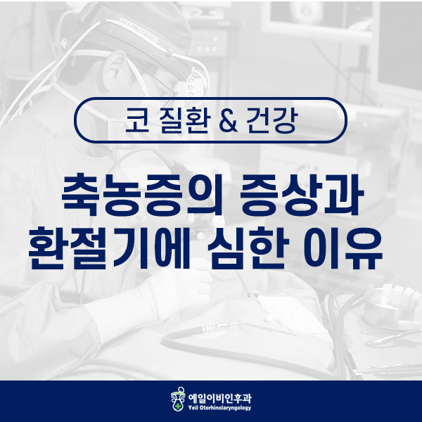 축농증의 대표적인 증상은 기침, 콧물, 코 막힘입니다. 콧물이 목 뒤에 쓰러져 비루가 나타나고, 그 때 목이 자극되어 기침이 납니다. 그리고, 노랗고 메스꺼운 콧물, 콧물이 목구멍에 가서 멈추면 심한 구취가 나는 등의 증상이 나타납니다.환절기에 심해지는 이유?축농증은 온도변화가 심한 환절기에 많이 발생합니다. 가을에서 겨울로 접어드는 시기에는 바이러스 등에 의한 감기 발생률이 높아져 감기가 만성 축농증으로 되고 찬 공기 자극, 실내 환기 부족 등을 원인으로 더욱 심해지는 양상을 보인다. 우리는 체온이 1도만 내려가도 면역력이 30% 이상 악화될 수 있습니다. 일교차가 심한 환절기에 면역력이 떨어지기 쉽고, 찬바람이 코 점막을 자극하여 악화되는 것입니다.축농증을 오랫동안 방치했을 경우?치료시기를 놓치면 만성화로 진행될 수 있어요 이 경우, 후각 장애나 안면통증, 두통 등의 통증을 동반할 수 있어요. 또한 기억력 감소, 집중력 감소, 안구건조증, 코골이 등이 나타나며 일상생활에 영향을 미칠 수 있으므로 만성화되기 전에 치료를 시작하는 것이 좋습니다.