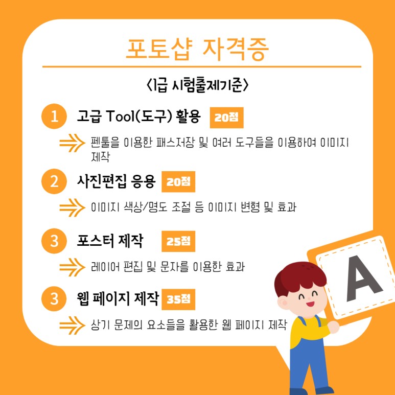 시험 출제기준을 보면 대략 어떻게 준비해야 하는지 알 수 있어요. 급수가1,2,3급으로나누어져있고,급수에따라서시험과목이모두다르다고해요. 대표적인 1급 문제를 살펴보도록 하겠습니다. 1) 고급 도구 활용 2) 사진 편집 응용 3) 포스터 제작 4) 웹 페이지 제작까지 입니다. 제한시간은1,2급은90분,3급은60분이고합격기준도1급은100점만점에70점이상,그이하는60점이상입니다.
