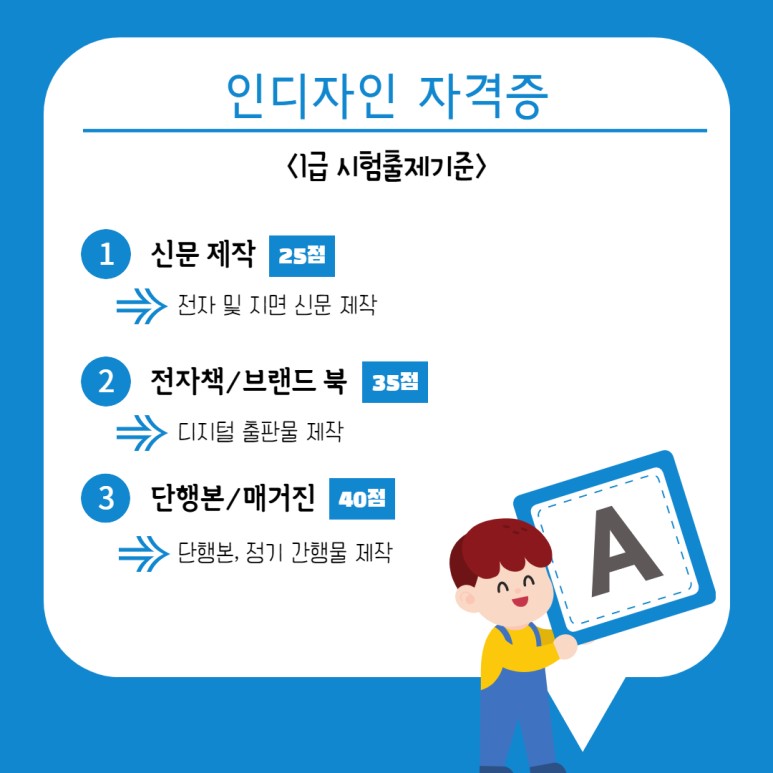두번째는 전자책/브랜드북입니다. 요즘은 종이책도 많이 읽지만 전자책도 수요가 많은 편입니다. 그렇기 때문에 작업능력도 충분히 검증되어야 합니다. 디지털 출판물 제작은 35점 만점입니다. 마지막은 단행본 / 매거진 입니다. 이것은 종이책을 만드는 과정을 검정하는 것으로, 가장 비중이 높아지고 있습니다. 40점 만점입니다.