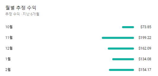 애드센스의 첫 수익 창출은 2020년 5월이 된 것 같습니다.2020년 5월 $86, 6월 $106, 7월 $82, 8월 $62의 수입이 생겼습니다.5, 6, 7월에는 한 달에 8편 정도 영상을 올린 것 같아요. (8월은 4개) 3개월간 조회수가 부진했지만 조회수의 큰 폭의 상승이 없는 한 유튜브 수입도 늘지 않았습니다.구독자가 늘어나면 조회수가 늘어나지만 정비례하는 것은 아닙니다.9월에는 영상을 5편 올려 $69.31의 수입.10월에는 영상을 7편 올려 $73.85의 수입.지난 11월에는 영상 하나가 조회수가 잘 나오고 영상 7편을 업로드해 $199.22의 수입이 생겼습니다.12월에는 7편의 영상을 업로드하여 $162.08의 수입이 생겼습니다.2021년1월에는 8편의 영상을 업로드하여 $134.08의 수입이 생겼습니다.지난 2월에는 7편의 영상을 올려 $154.17의 수입이 생겼습니다. 어떤 영상이 서덕산(?)해서 수입이 좀 늘었어요.