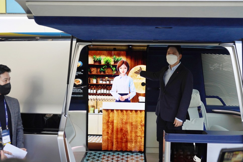 사람이 탑승하는데 버추얼 휴먼 레어가 안에서 반겨주더라고요. 레어의 가이드에 따라 차량의 상품과 서비스를 제어하고 공간을 활용할 수 있다고 해요. 가전 제품인 LG답게 미래의 집처럼 차량 내부를 잘 구성하고 있었습니다.