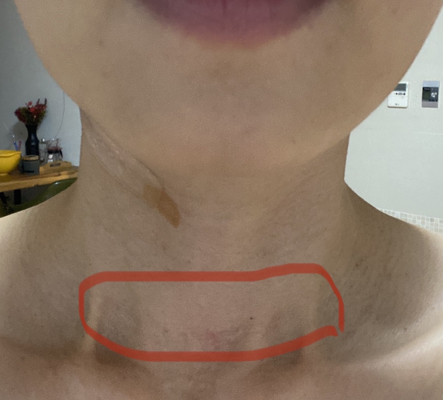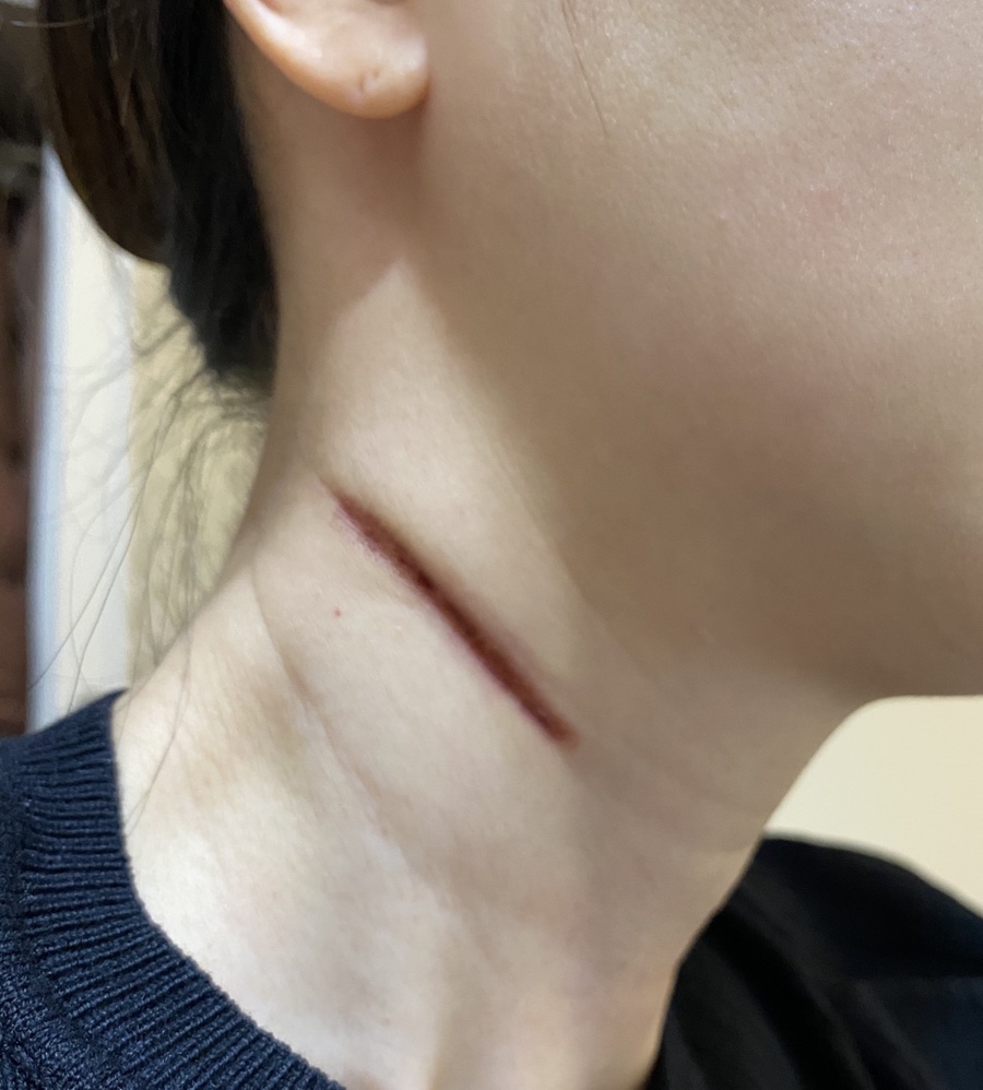 처음의 수술과 마찬가지로, 걱정이었던 수술 후의 흉터.이번에는 목 중간선을 따라 절개한 것이 아니라 오른쪽 귀 밑 목 부분을 절개해 위치상 눈에 잘 띄었다.