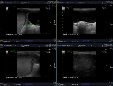 담낭 내에 담석이 발견되어 양쪽에 뚜렷한 낭포성 자궁내막 증식, 액체저류, 자궁수의 뚜렷한 비후를 보고 자궁축농증을 의심/진단할 수 있었습니다.