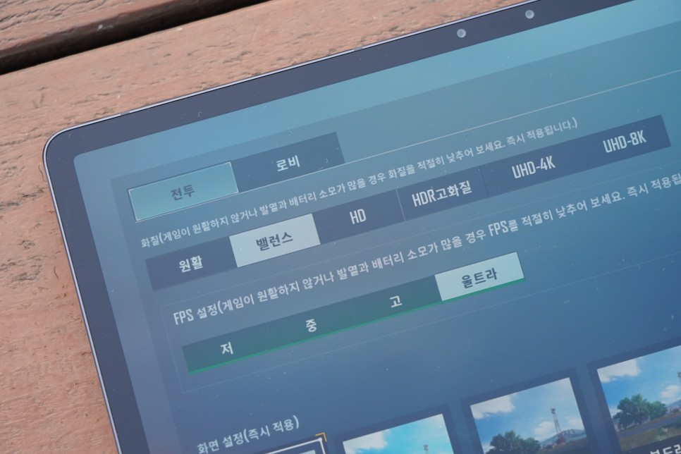 이는 어느 정도 배틀 그라운드 모바일을 밸런스 화질&FPS 울트라의 조합, 또는 HD 화질에 FPS, 조합 모두 렉이나 화면 어긋남 없이 소화할 수 있는 스펙입니다.