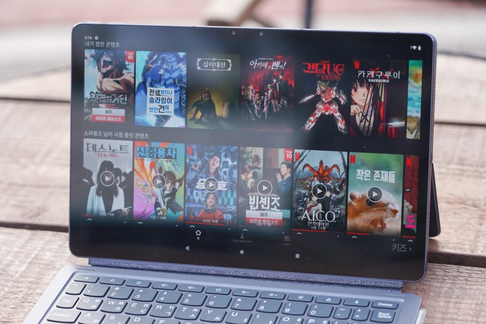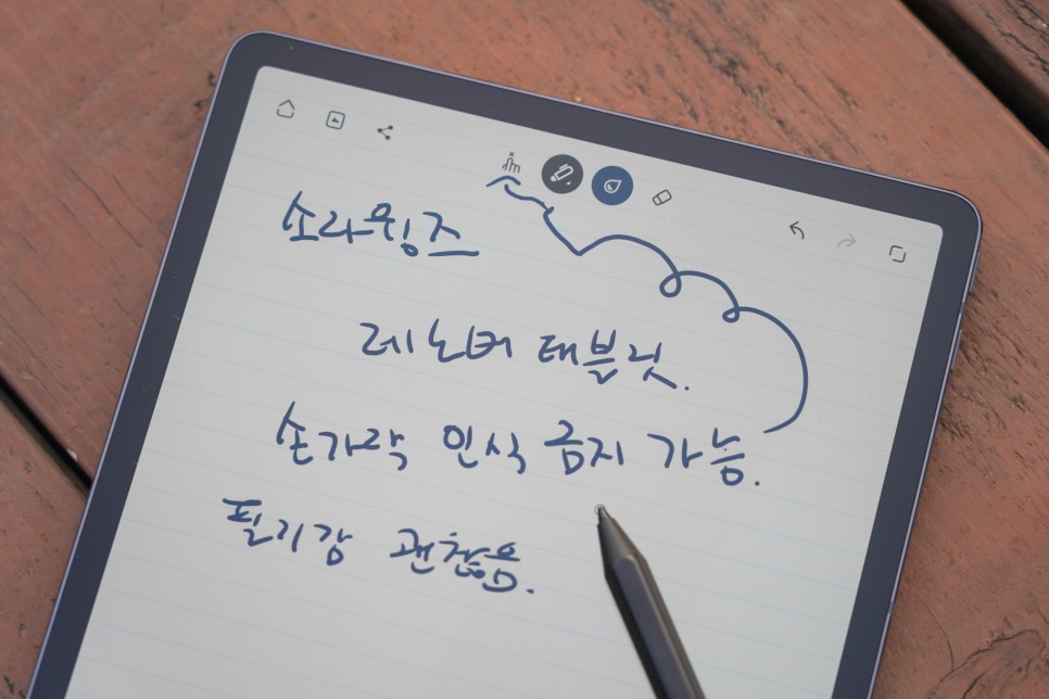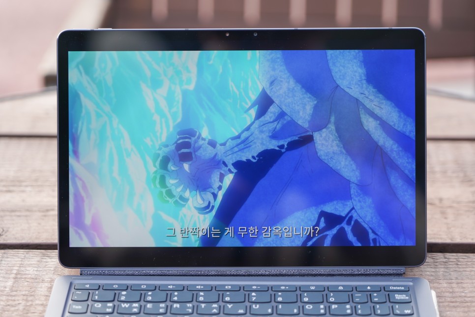 재택근무의 장점은 꼭 집이 아니라 카페, 공원, 도서관, 그냥 제 놀이터 등 컴퓨터만 있으면 장소를 가리지 않고 일할 수 있다는 점입니다. 그동안 겨울이라 거의 실내에서만 일했는데 봄이 되면 낮에는 밖에서 햇볕을 쬐며 하니까 더 잘 녹는 것 같아서 요즘은 근처 공원에 태블릿 하나만 가지고 일하거나 넷플릭스를 감상하고 있습니다. 화면 밝기가 500니트여서 태양광이 강한 시간대에도 야외에서 사용하는데 전혀 불편하지 않았습니다.