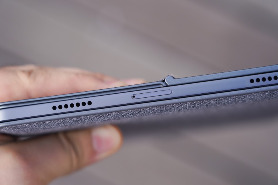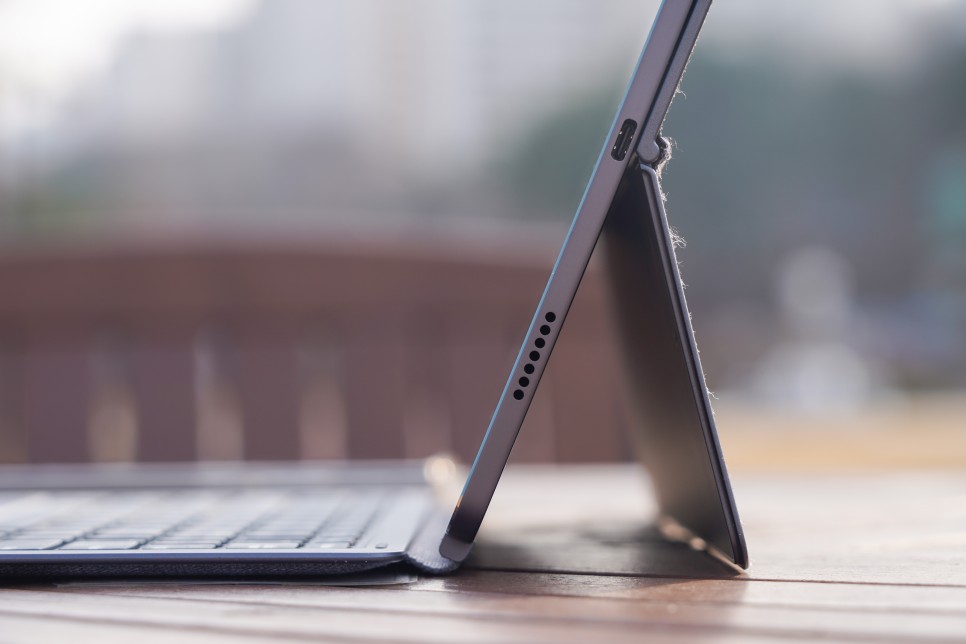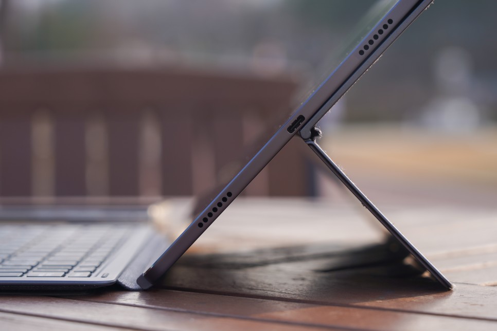 슬레이트 그레이 색상으로 출시되어 탈레노보 탭 P11 프로 하단에 보시면 USB Type-C 포트가 보입니다. USB-PD, OTG, 오디오 기기에 대응해 디스플레이가 출력되기 때문에, 모니터에 접속해 사용하는 것도 가능합니다. 문서작업이라던가,웹서핑,디자인도구같은안드로이드OS도대부분다할수있고어떤면에서는PC용보다더편한것들도많기때문에모니터에연결해서컴퓨터대용으로사용하는것도좋은활용방법입니다.