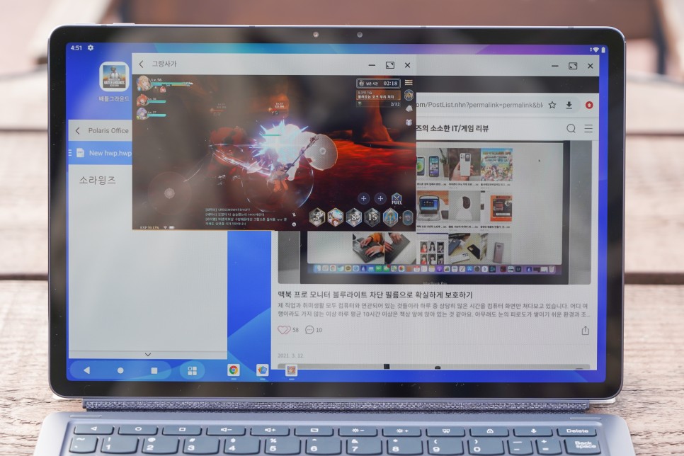 화면인쇄, 멀티 윈도 등의 전용 키를 배치하여 보다 쾌적하게 사용할 수 있습니다. 특히 다중창의 경우 PC처럼 한 화면에 여러 개의 앱을 띄우고 동시에 작업을 진행할 수 있어서 매우 편리했습니다. 모바일 게임을 켠 상태에서 워드 타이핑과 자료 검색까지 동시에 할 수 있었으니까요. 게임 중에는 일부 윈도 모드를 지원하지 않는 경우도 있었지만, 그 외의 앱들은 거의 문제없이 정상적으로 사용할 수 있었습니다.