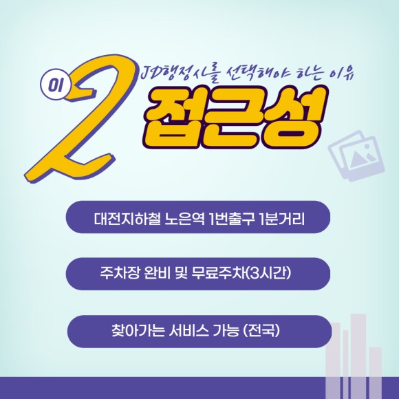 두 번째는 접근성입니다.차량으로 오시면 유성IC에서 내려 5분 이내에 오실 수 있으며 건물 내에 주차장이 지하 3층까지 있어 무료로 넓은 주차장을 이용하실 수 있습니다.차량의 출입구도 넓기 때문에 운전이 미숙한 분도 문제 없을 테고요.차가 없으신 분은 노은역 1번 출구로 나오면 사무실 파란 간판이 바로 보입니다.걸어서 1분 거리도 안 돼요.그리고 대전이 전 국토의 중간에 있는 것처럼 찾아가는 서비스도 가능합니다.