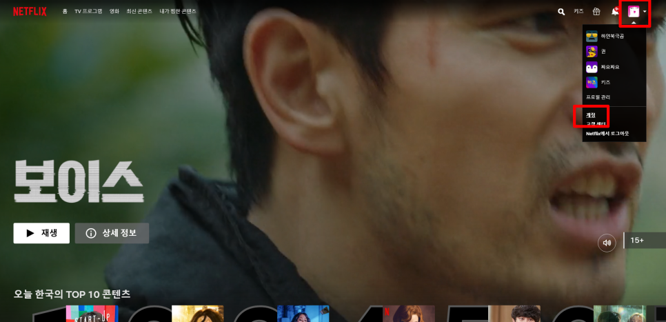 이번에는 PC부터 바꾸는 법을 알려드릴게요 마찬가지로 오른쪽 상단에 내 프로필을 클릭을 통해서 빨간 사각상자 부분을 보도록 하겠습니다.