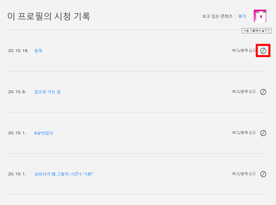 드디어! 자기가 본 콘텐츠가 쭉 날짜별로 나열되어 있습니다 여기에서 우측에 보이는 동그라미 원 안에 막대기로 표시된 부분을 터치하면 숨김 기능을 사용할 수 있습니다.