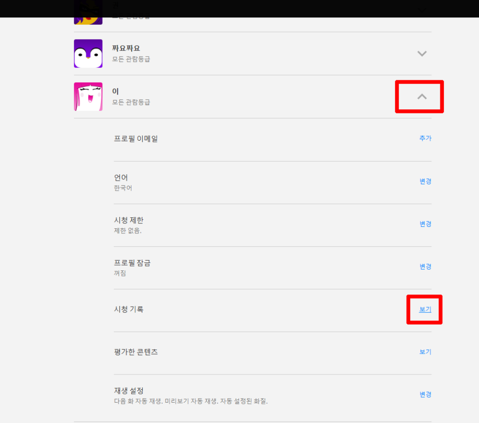 중간에 보면 ‘시청 기록’ 부분이 보여요. 여기서 다시 보기 터치!