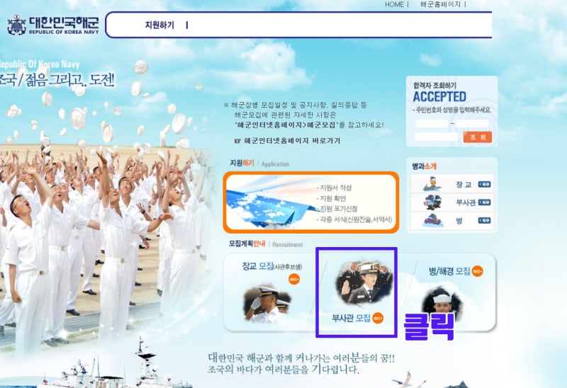 지원서 접수는 인터넷으로 이뤄진다.모집 공고를 본 해군본부가 아닌 해군 모집 사이트가 따로 있다.네이버에 해군 모집이라고 입력하고 해군 모집센터에 들어가면 된다.들어가 보면 연륜이 달린 사이트가 나온다.